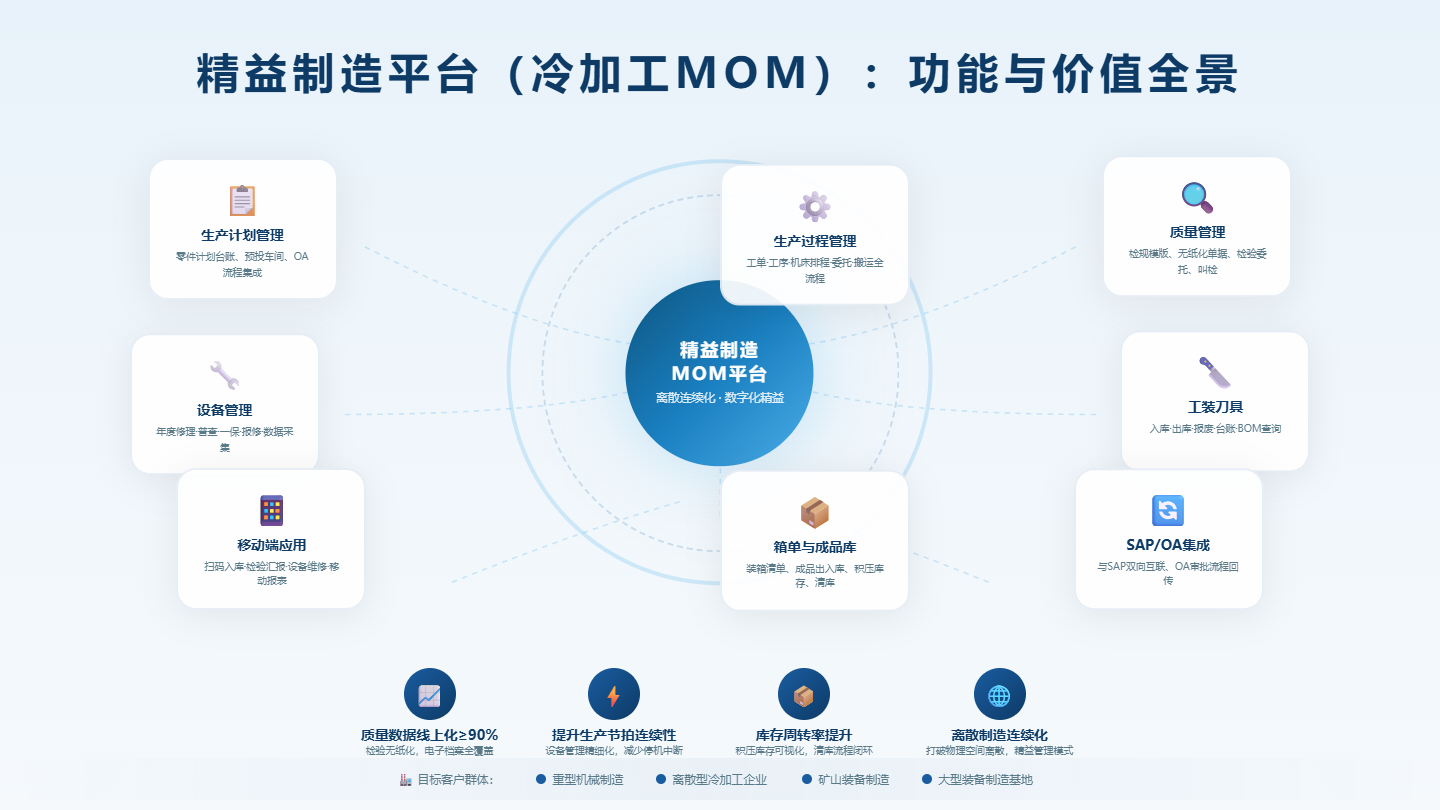 平台支持多工厂、多品种、多工艺路线的柔性管理,已在汽车零部件、特种钢铁、装备制造等行业成功落地,帮助企业缩短交付周期、提升产品良率、降低运营成本。